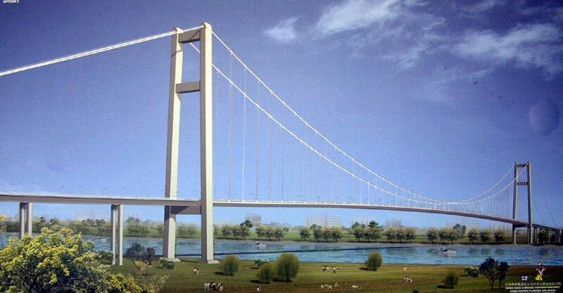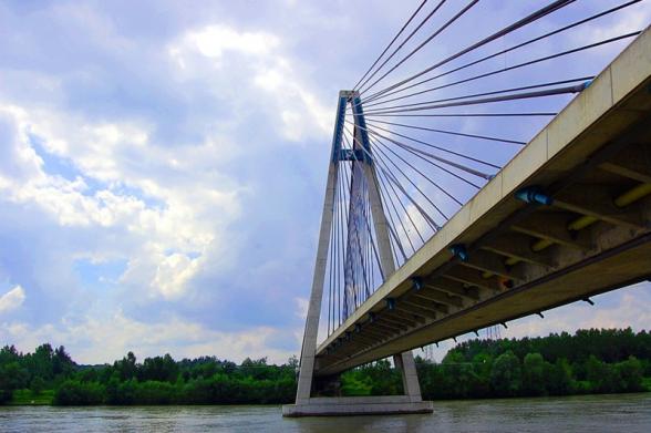 Beschreibung: Bau einer Hängebrücke über die Donau